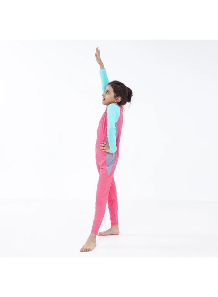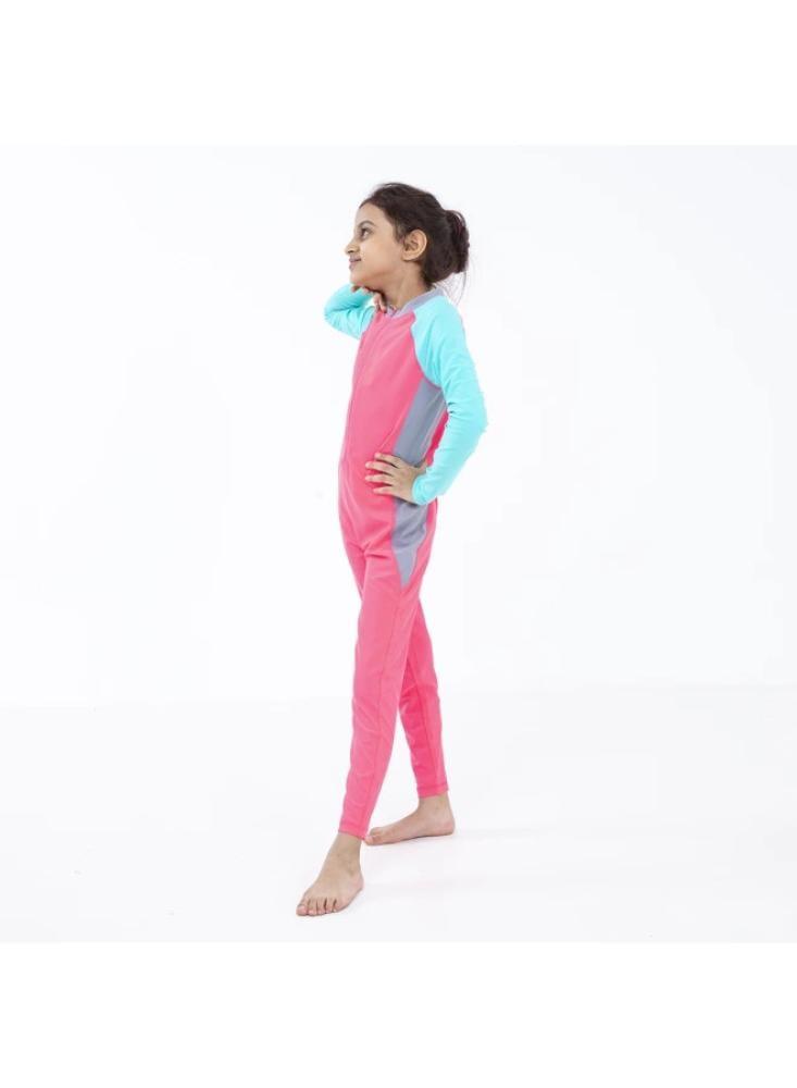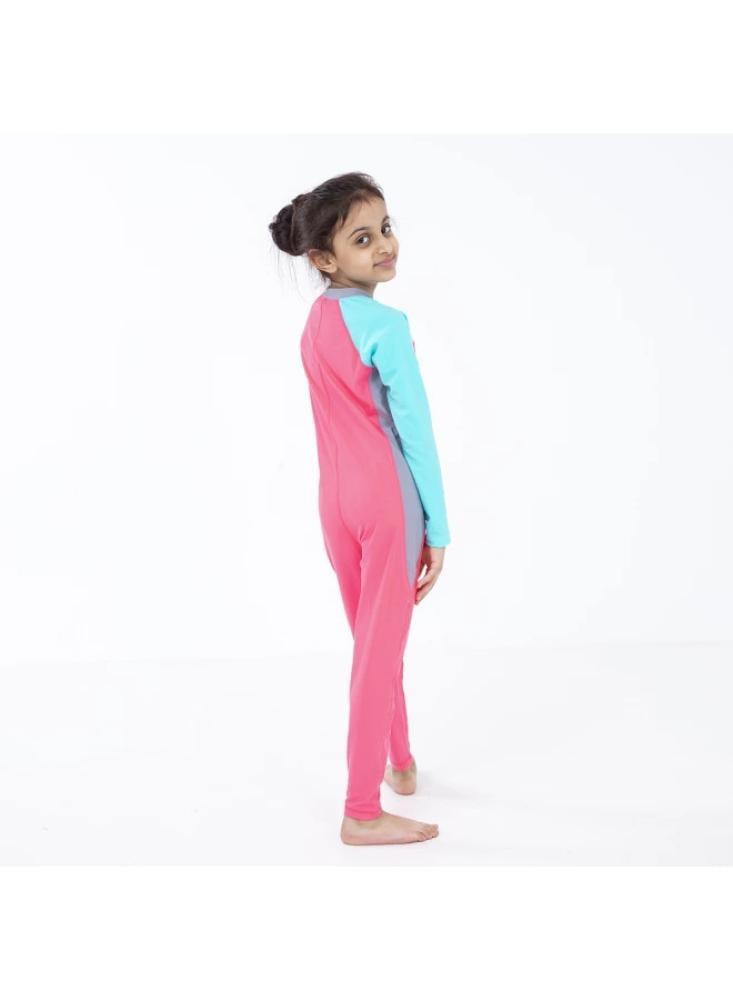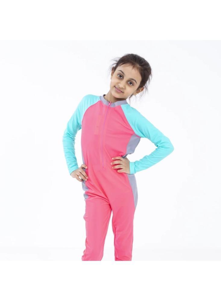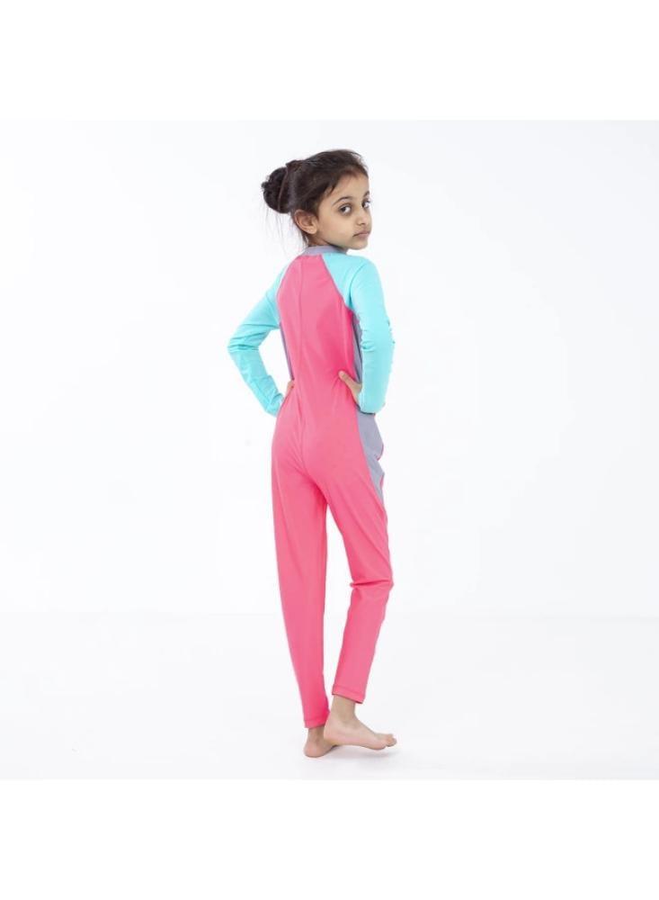 تصميم ناعم: مزيج رائع من اللون الوردي السماوي والأزرق الفاتح يعطي إطلالة ناعمة وأنيقة.\nراحة مثالية: مصنوع من مادة ناعمة ومرنة تسمح بحرية الحركة في الماء.\nحماية من أشعة الشمس: يوفر حماية من أشعة الشمس الضارة.