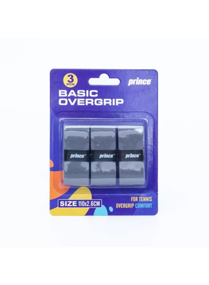 عزز قبضتك وراحتك مع مقابض Prince 3 Pack Basic Overgrip. توفر هذه المقابض المتينة والقادرة على امتصاص العرق تحكمًا وإحساسًا ممتازين، مما يجعلها مثالية للاعبي التنس من جميع المستويات.\n\nالميزات الرئيسية:\nقبضة محسنة: تحكم وإحساس محسنان لضربات دقيقة.\nمادة ماصة للعرق: تحافظ على يديك جافة ومريحة.\nبنية متينة: أداء يدوم طويلاً، حتى أثناء اللعب المكثف.\nسهولة الاستخدام: سهلة التركيب والصيانة.