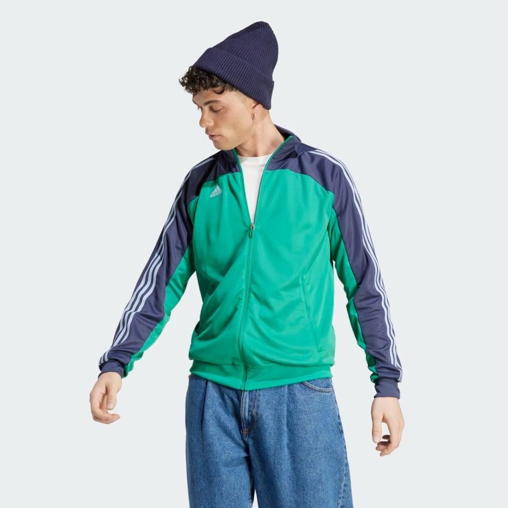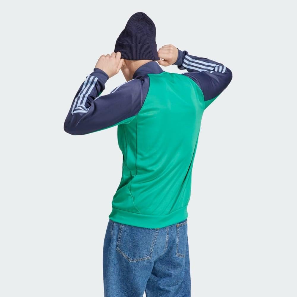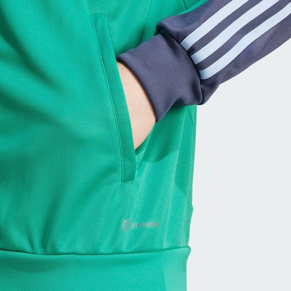 هذا الجاكيت يجمع بين الأداء الرياضي والتصميم العصري، ليناسب جميع أنشطتك اليومية، سواء كنت في طريقك إلى التمرين، أو في نزهة مع الأصدقاء، أو حتى في مناسبة كاجوال. بفضل تقنية AEROREADY، ستبقى جافًا ومرتاحًا طوال اليوم.\nتقنية AEROREADY تُحافظ على جفافك وانتعاشك:\nتخلص من الشعور بالرطوبة والتعرق مع تقنية AEROREADY المتطورة التي تمتص العرق وتبخرّه بسرعة، لتحافظ على جفافك وراحتك حتى أثناء النشاطات البدنية.\nتصميم عملي و مريح مع لمسات رياضية أنيقة:\n\n\n سحاب كامل مع ياقة منتصبة مضلعة: يوفران لك خيارات متعددة للارتداء، سواء كنت ترغب في إبقاء الياقة مرفوعة لحماية إضافية من البرد أو تركها مفتوحة لمزيد من التهوية. الياقة المضلعة تُضفي لمسة جمالية أنيقة.\n جيوب أمامية بسحاب: لحفظ أغراضك الشخصية بأمان، مثل الهاتف والمفاتيح والمحفظة.\n أصفاد وحاشية مضلعة: تُحكم إغلاق الجاكيت وتمنع دخول الهواء البارد، كما تُضفي لمسة جمالية أنيقة.\n حلقة تعليق: لتسهيل تعليق الجاكيت وتخزينه.\n شريط 3-Stripes بتأثير ثلاثي الأبعاد: يُضيف لمسة رياضية نهائية مميزة تُعبّر عن فخر أديداس.\n قصة عادية: تُوفر حرية الحركة والراحة المثلى.\n\nصديق للبيئة:\nمصنوع من بوليستر معاد تدويره بنسبة 100%، هذا الجاكيت يُساهم في جهود أديداس للحد من النفايات البلاستيكية والحفاظ على البيئة.\nمواصفات أساسية:\n\n\n الخامة: 100% بوليستر معاد تدويره.\n التقنية: AEROREADY لامتصاص الرطوبة.\n التصميم: سحاب كامل وياقة منتصبة مضلعة، جيوب أمامية بسحاب، أصفاد وحاشية مضلعة، حلقة تعليق، شريط 3-Stripes بتأثير ثلاثي الأبعاد.\n القصة: عادية.\n اللون: أخضر Court Green / كحلي Shadow Navy.\n\nجدول المقاسات\n