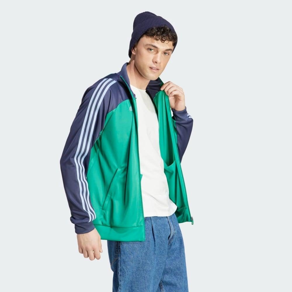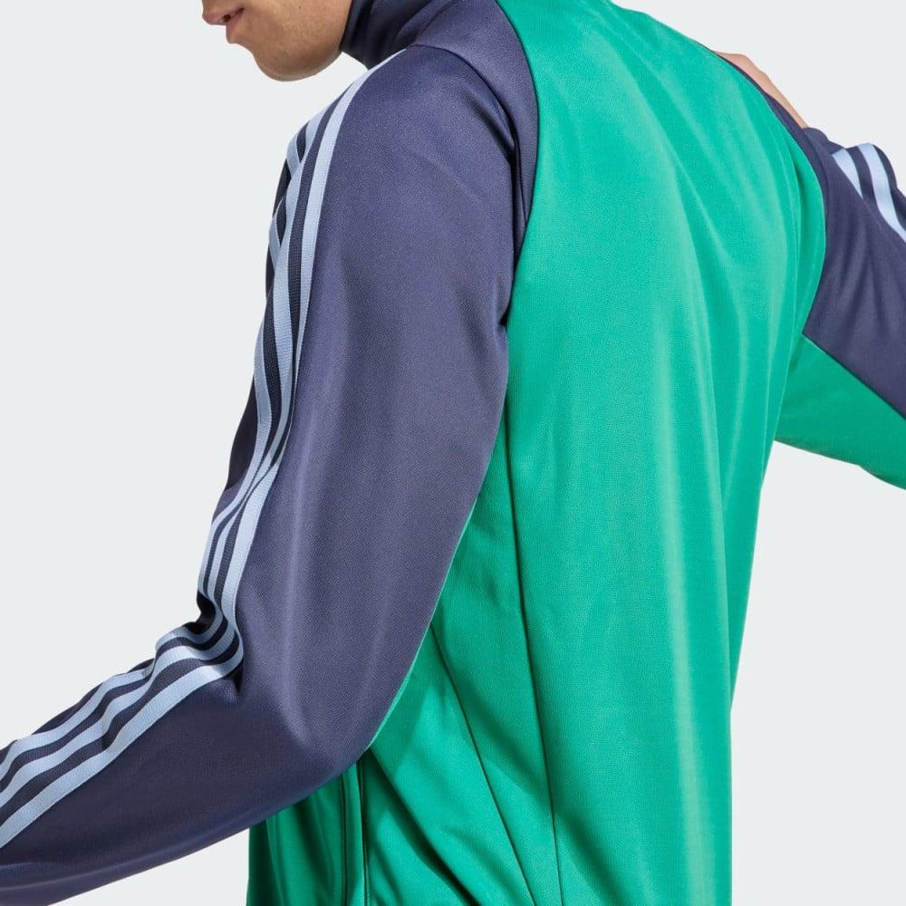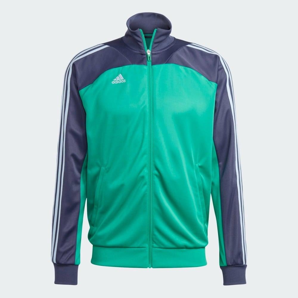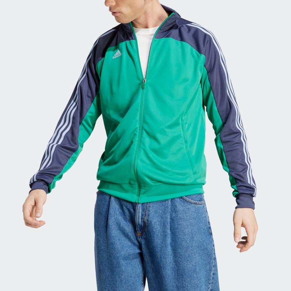 هذا الجاكيت يجمع بين الأداء الرياضي والتصميم العصري، ليناسب جميع أنشطتك اليومية، سواء كنت في طريقك إلى التمرين، أو في نزهة مع الأصدقاء، أو حتى في مناسبة كاجوال. بفضل تقنية AEROREADY، ستبقى جافًا ومرتاحًا طوال اليوم.\nتقنية AEROREADY تُحافظ على جفافك وانتعاشك:\nتخلص من الشعور بالرطوبة والتعرق مع تقنية AEROREADY المتطورة التي تمتص العرق وتبخرّه بسرعة، لتحافظ على جفافك وراحتك حتى أثناء النشاطات البدنية.\nتصميم عملي و مريح مع لمسات رياضية أنيقة:\n\n\n سحاب كامل مع ياقة منتصبة مضلعة: يوفران لك خيارات متعددة للارتداء، سواء كنت ترغب في إبقاء الياقة مرفوعة لحماية إضافية من البرد أو تركها مفتوحة لمزيد من التهوية. الياقة المضلعة تُضفي لمسة جمالية أنيقة.\n جيوب أمامية بسحاب: لحفظ أغراضك الشخصية بأمان، مثل الهاتف والمفاتيح والمحفظة.\n أصفاد وحاشية مضلعة: تُحكم إغلاق الجاكيت وتمنع دخول الهواء البارد، كما تُضفي لمسة جمالية أنيقة.\n حلقة تعليق: لتسهيل تعليق الجاكيت وتخزينه.\n شريط 3-Stripes بتأثير ثلاثي الأبعاد: يُضيف لمسة رياضية نهائية مميزة تُعبّر عن فخر أديداس.\n قصة عادية: تُوفر حرية الحركة والراحة المثلى.\n\nصديق للبيئة:\nمصنوع من بوليستر معاد تدويره بنسبة 100%، هذا الجاكيت يُساهم في جهود أديداس للحد من النفايات البلاستيكية والحفاظ على البيئة.\nمواصفات أساسية:\n\n\n الخامة: 100% بوليستر معاد تدويره.\n التقنية: AEROREADY لامتصاص الرطوبة.\n التصميم: سحاب كامل وياقة منتصبة مضلعة، جيوب أمامية بسحاب، أصفاد وحاشية مضلعة، حلقة تعليق، شريط 3-Stripes بتأثير ثلاثي الأبعاد.\n القصة: عادية.\n اللون: أخضر Court Green / كحلي Shadow Navy.\n\nجدول المقاسات\n