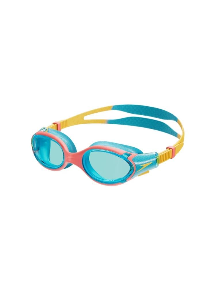 نظارة السباحة Biofuse junior الخاصة بنا أصبحت أفضل. نقدم لكم نظارة السباحة Biofuse 2.0 Junior الجديدة الملونة. تشترك في نفس تقنية Speedo Biofuse® الأكثر مبيعًا مثل نظارتنا للبالغين، وهي الآن تأخذ الراحة والملاءمة إلى المستوى التالي مع آلية زر ضغط جديدة تمامًا بانتظار براءة اختراع وأختام فائقة النعومة بتصميم مستوحى من المرجان. مع الألوان المرحة والمشرقة وتصميم سهل التركيب، فهي كل ما تحبه في Biofuse - الآن أفضل.\n\nالميزات:\nلا تزال تتميز بتقنية Speedo Biofuse® الأكثر مبيعًا لراحة مرنة في كل مرة تسبح فيها\nأختام فائقة النعومة بتصميم أخدود جديد، توفر نفس الملاءمة الأكثر مبيعًا\nتصميم إطار داخلي مرن وقوي جديد، يمتد ويتكيف لملاءمة فائقة الإحكام - ويوفر ثباتًا فائقًا\nشكل عدسة جديد الصنع، يوفر رؤية محيطية ممتازة\nآلية زر ضغط جديدة تمامًا بانتظار براءة اختراع لملاءمة سريعة وآمنة\nحزام أنيق منخفض الارتفاع مع تروس جر لملاءمة آمنة ومريحة\nطلاء مضاد للضباب بالرش توفر رؤية واضحة للغاية\nحماية فائقة من الأشعة فوق البنفسجية مع عدسات البولي كربونات التي تتميز بحماية من الأشعة فوق البنفسجية 400\nمناسبة للصغار من سن 6 إلى 14 سنة
